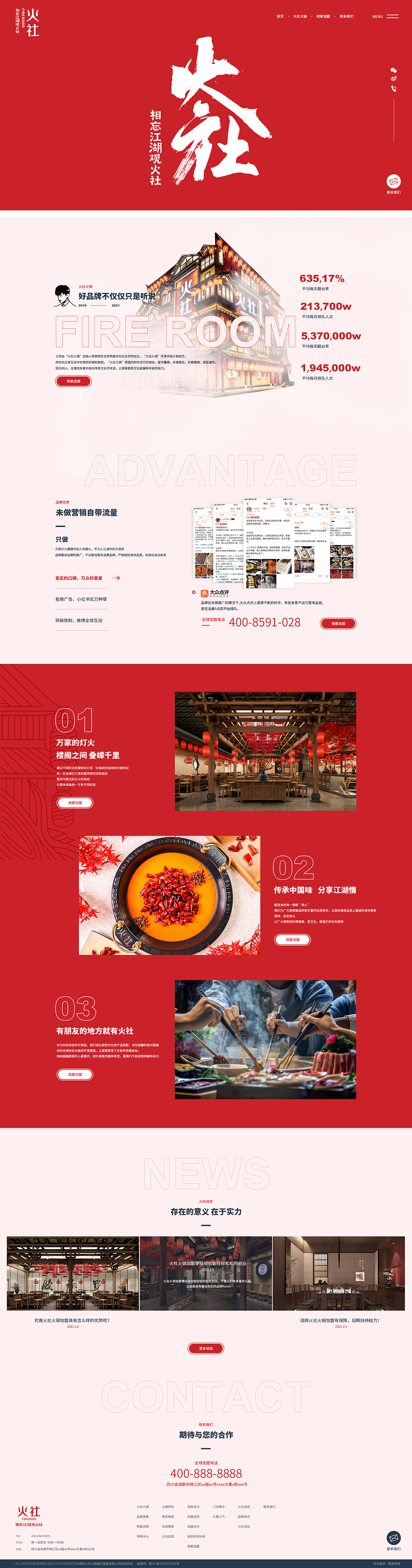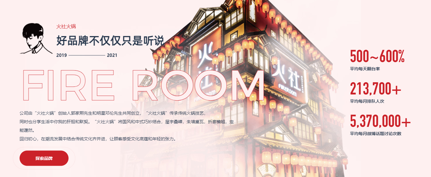 許多想要加盟火社品牌的加盟商往往會比較重視一個(gè)品牌的運(yùn)營、盈利能力,而人們對于數(shù)字的敏感度遠(yuǎn)高于其他文字,所以在本次網(wǎng)站建設(shè)的時(shí)候,我們特意把火社品牌的每天翻臺率、每月排隊(duì)人次、微博話題討論次數(shù)數(shù)據(jù)展示出來,體現(xiàn)品牌的可持續(xù)能力。