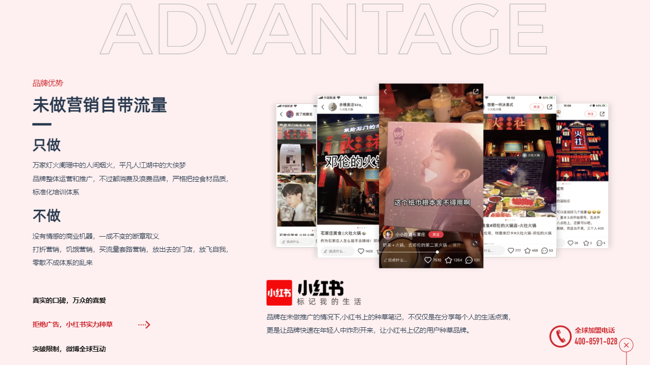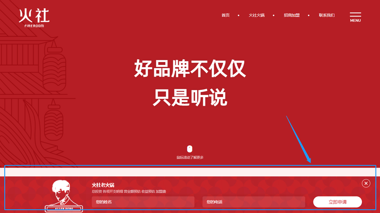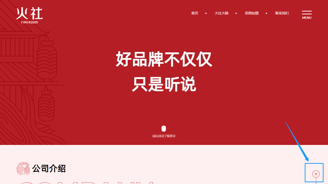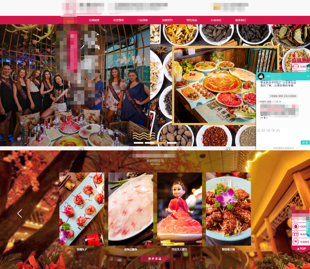 (愛蜀美極度注重用戶瀏覽網(wǎng)頁的舒適度和不被打擾性,非常反感一些營銷工具的強(qiáng)制彈窗、反復(fù)彈出、狗皮膏藥似的占滿屏幕的四周,只保留必要的咨詢通道。所以我們只在網(wǎng)頁底部加入了一個(gè)加盟窗口,用戶可以隨時(shí)收縮/打開窗口,在尊重用戶體驗(yàn)感的情況下,也體現(xiàn)了火社火鍋把服務(wù)放在首位的品牌理念↑)