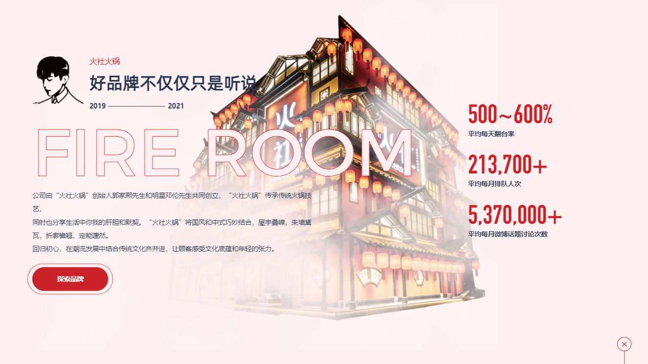 (我們將火社火鍋旗艦店的輪廓摳出來,融合在整個(gè)背景里面,在不干擾用戶閱讀品牌介紹和關(guān)鍵數(shù)據(jù)的同時(shí),讓門店線下的裝修風(fēng)格和線上網(wǎng)頁達(dá)到一個(gè)契合↑)
