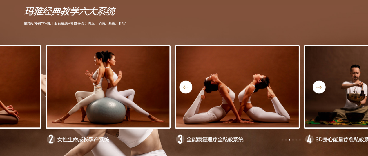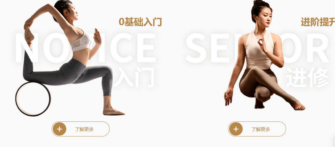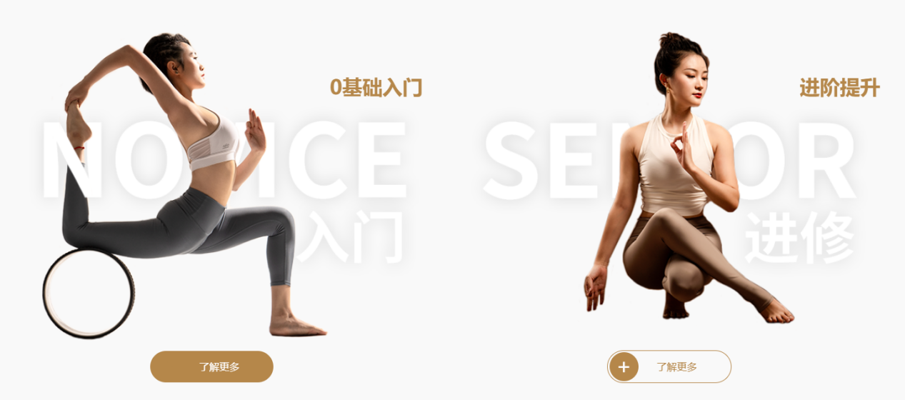 瑪雅瑜伽本次官網的受眾人群有很大一部分是想要學習瑜伽的學員,其中有0基礎的瑜伽學員,也有有一定基礎想要提升的學員,還有孕前孕后想要保持身材的學員等各種愛美的女士,于是我們在首頁重要位置規劃了這部分人群關注的欄目【0基礎入門】和【進階提升】