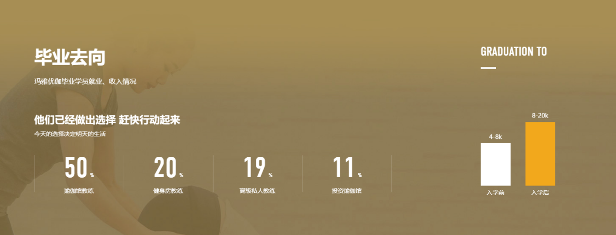 瑪雅瑜伽除了針對學員,其本身還是體育總部全國健身瑜伽指導委西南區官方指定考點,也是目前西南區國家機構唯一指定授權的瑜伽教練培訓學校,為眾多瑜伽教練提供考證服務,對于這部分用戶關注的從業方向、收入情況等我們也在首頁通過數據進行了直觀展示,提升這部分用戶的信心的同時也促進轉化率。